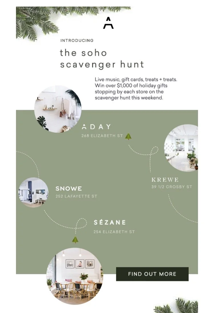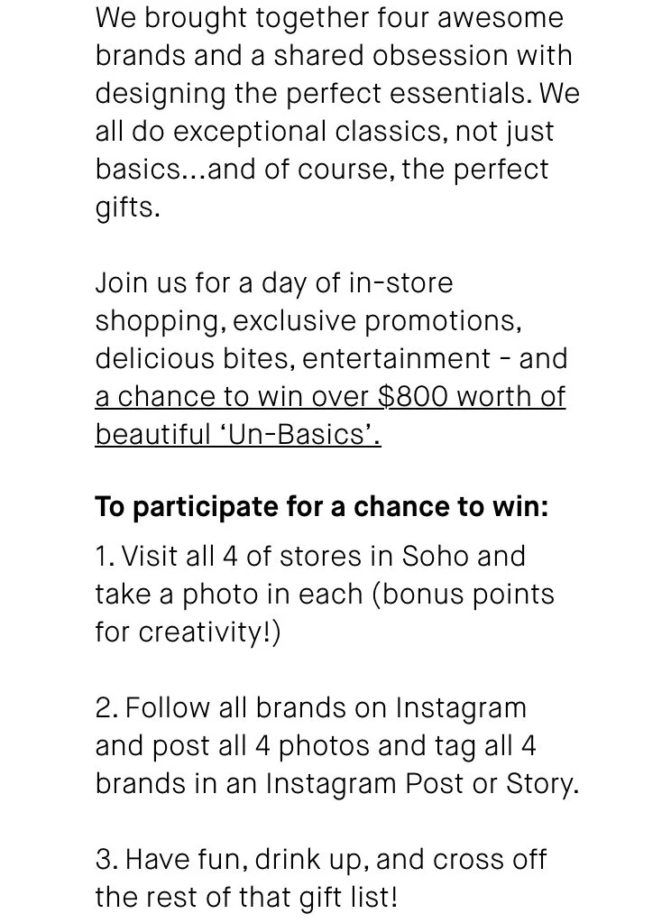 Four independent brands - ADAY, Sezane, Snowe, and Krewe - marketed a “scavenger hunt”, urging shoppers to visit each of their Soho stores yesterday for drinks and gifts with purchase tied to holiday shopping. While I think some of the stores could’ve done more to be eventworthy, I liked the marketing angle and had positive store experiences (especially at ADAY, where I’m a loyalist, and Snowe). There’s so much potential for more event series and partnerships like this. And undoubtedly, customers acquired this way are infinitely more valuable than Instagram followers.